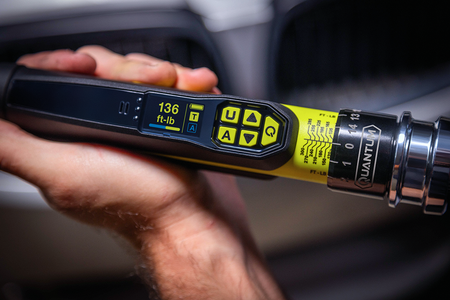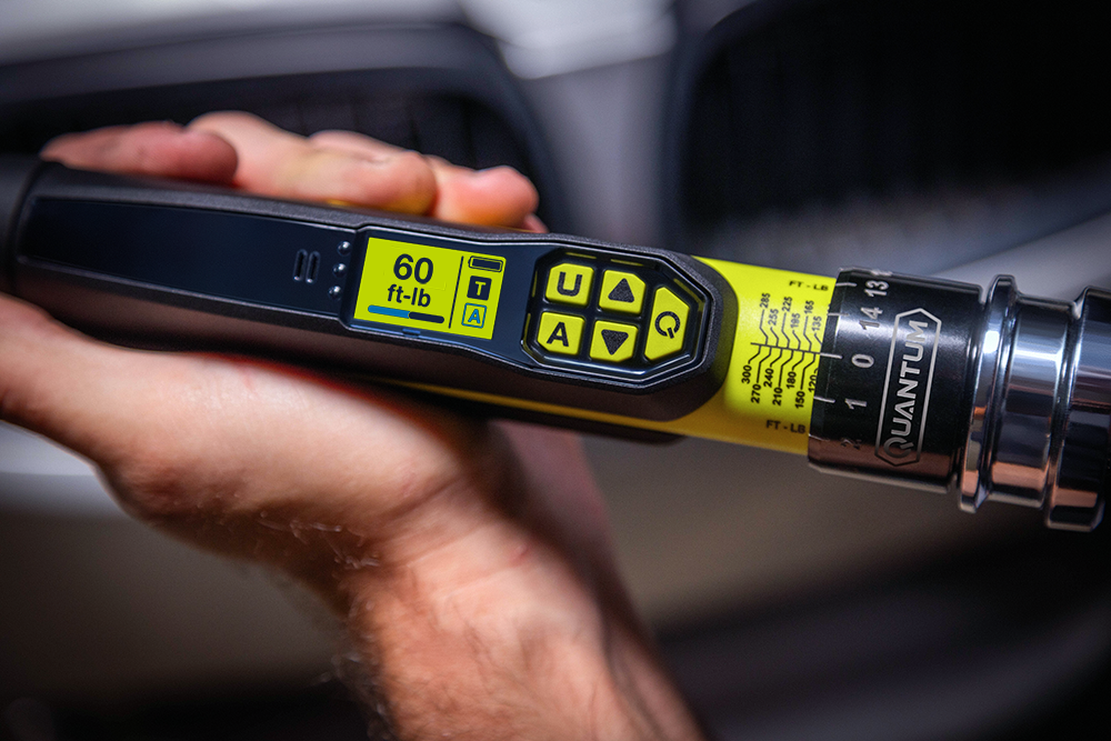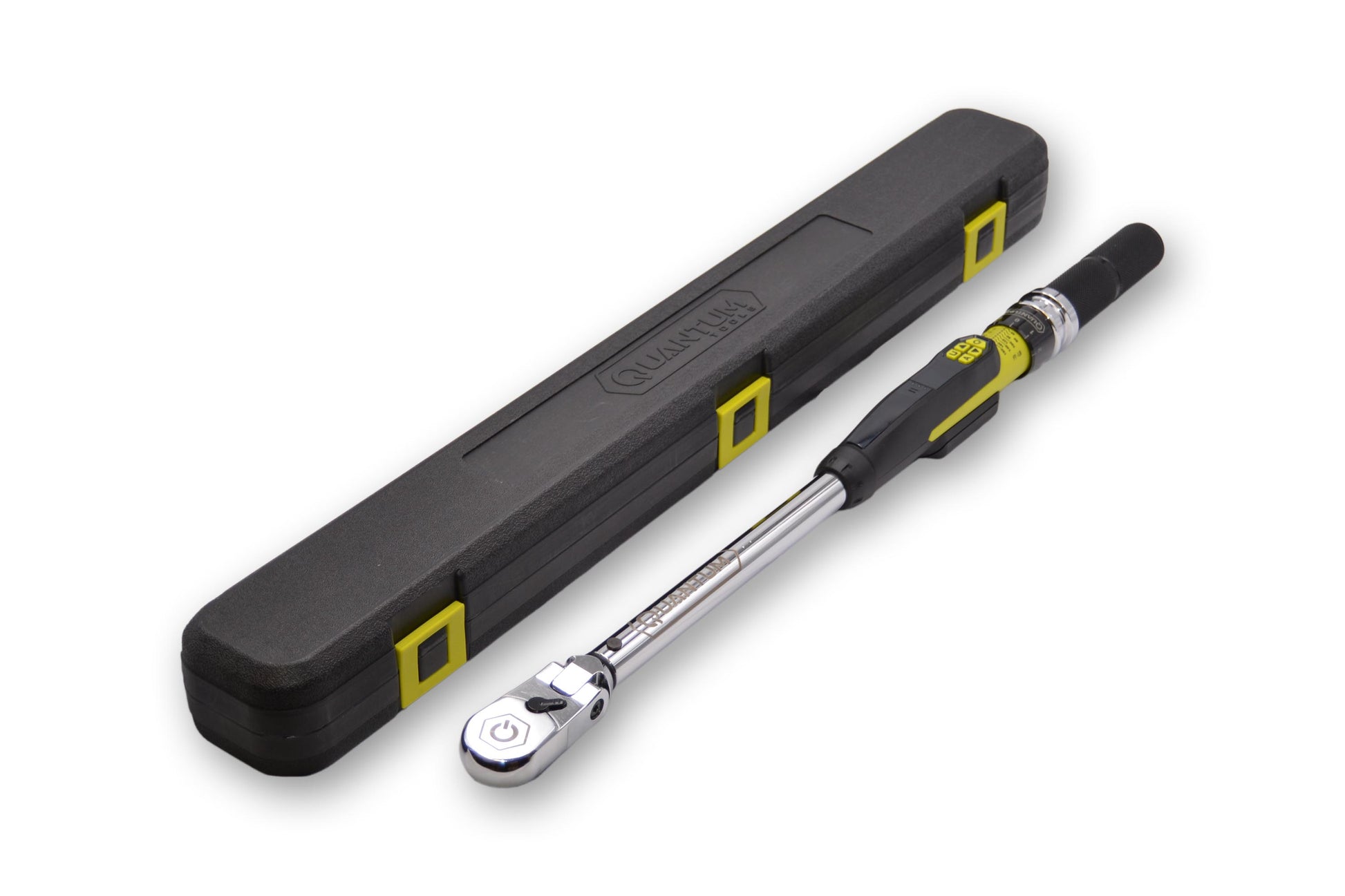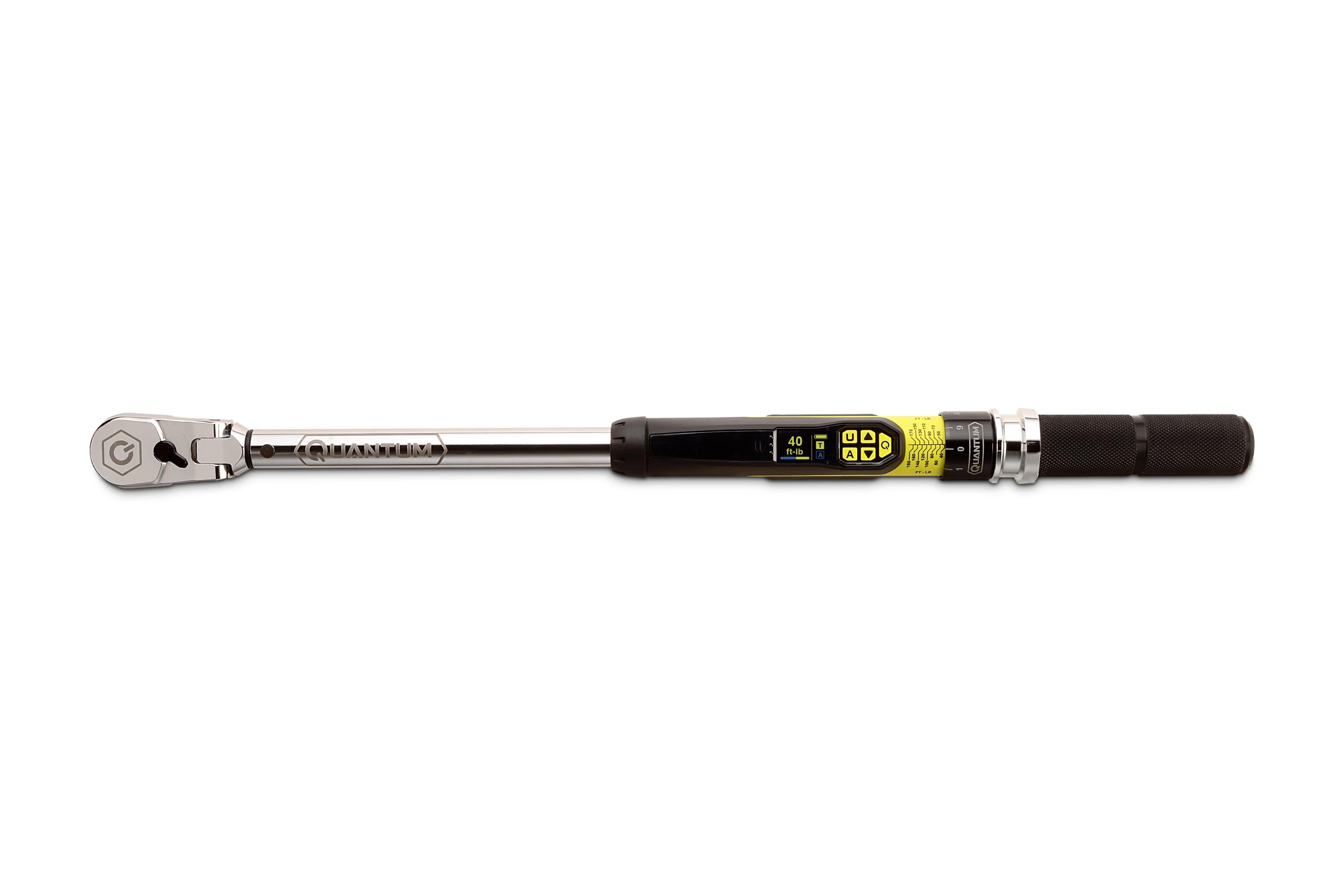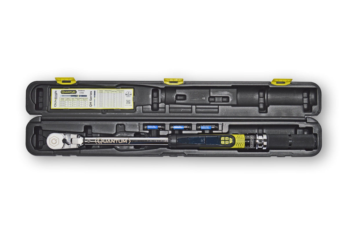 Introducing the Click2Angle from Quantum Tools. Part clicker, part digital, it's the first hybrid torque wrench, offering the best combination of speed and angle accuracy. To use the Click2Angle, set the target torque with the adjustment handle, then confidently turn the fastener until you feel the click. Afterward, effortlessly switch to angle mode using the digital display panel—no external torque angle meter necessary.